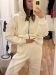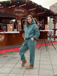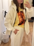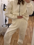 Тканина: тринитка турецька якості пеньє, на флісіЩільність; 320 г/м2 Склад: 80 котон, 20 поліестерКрій худі: оверсайз, рукав спущений, на рукавах, горловині та по низу худі - резинка кашкорсе, є кишеня, капюшон без шнурівокКрій штанів: вільні у обємі, на талії та внизу на резинках, вверху резинка декоративно прошита тричі.